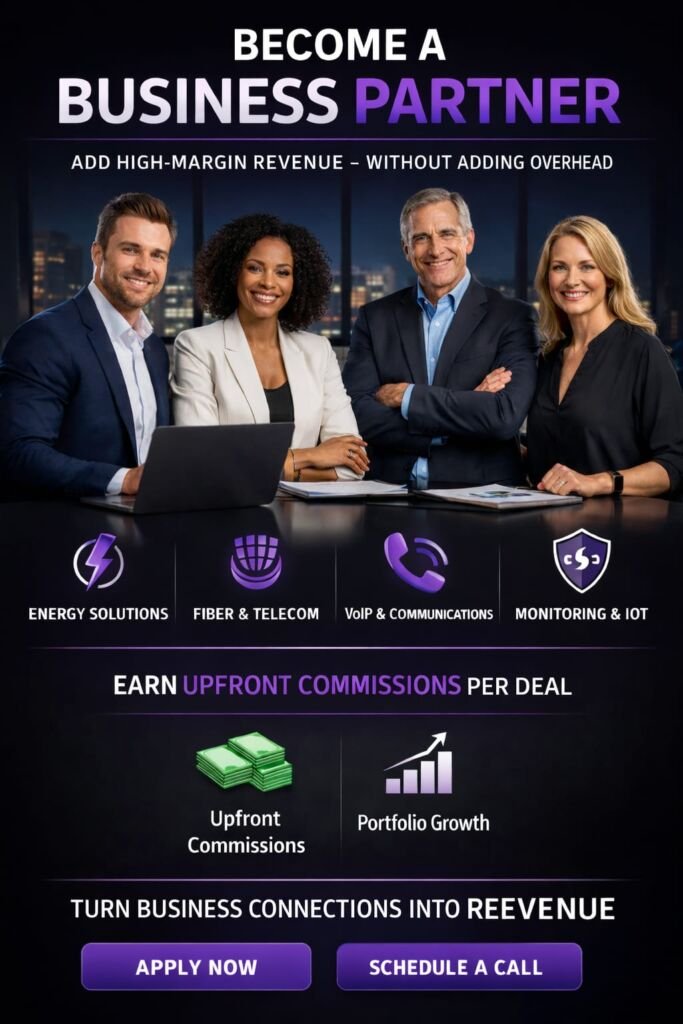 Turn your existing business relationships into long-term residual income with enterprise-grade energy, telecom, fiber, VoIP, and monitoring solutions.